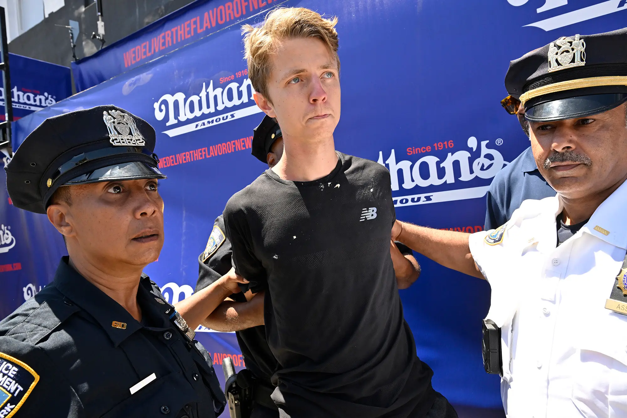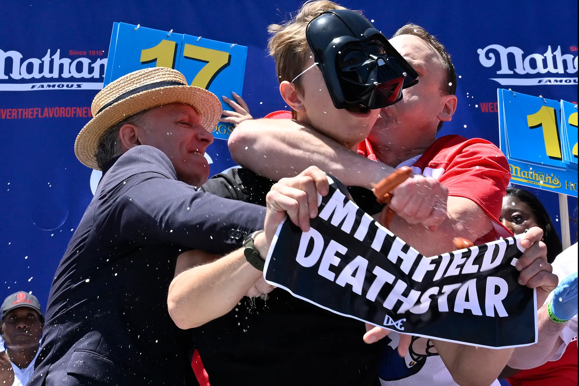 Joey Chestnut chegou ao topo do Nathan’s Hot Dog Eating Contest novamente na segunda-feira, conquistando um recorde de 15 vitórias na competição anual de 4 de julho – mesmo colocando um intruso em um estrangulamento no meio do evento.