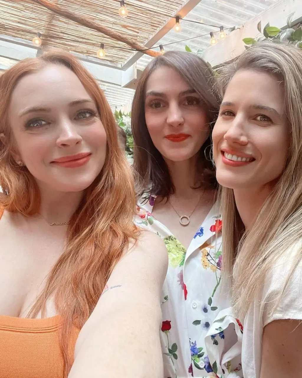 - A atriz usou um vestido laranja para a festa. lindsaylohan/Instagram